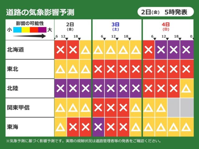 北海道は雪や風のピークが過ぎましたが、4日(日)は気圧の谷の影響で雪の降り方が強まり、道路への影響が大きくなりそうです。東北は4日(日)にかけて断続的に雪が降り、さらに積雪が増えるでしょう。引き続き、交通への影響に注意が必要です。