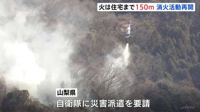 山梨県上野原市で発生した山林火災は延焼が続いています。火は最も近い住宅までおよそ150メートルに迫っていて、消防などはけさ消火活動を再開しました。