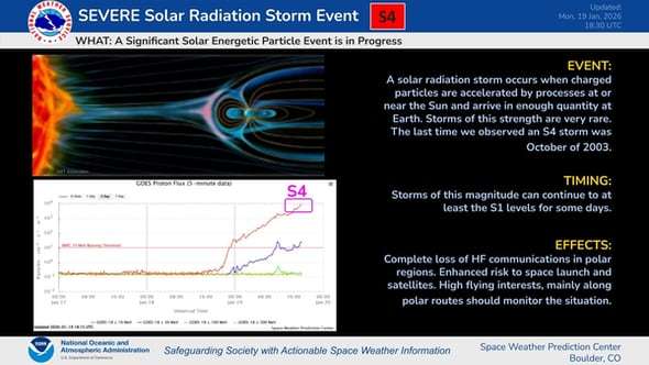 米海洋大気局(NOAA)は1月19日(現地時間)、直近の太陽活動により、S4クラスの太陽放射線嵐とG4クラスの地磁気嵐が発生しているとして警戒を呼び掛けた。太陽放射線嵐は2003年10月の通称「ハロウィン嵐」以来、23年ぶりの規模という。