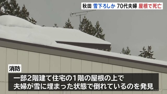雪下ろし作業中か 70代夫婦が死亡 消防 屋根の上で雪に埋まったままの夫婦発見 その場で死亡確認 秋田・大仙市