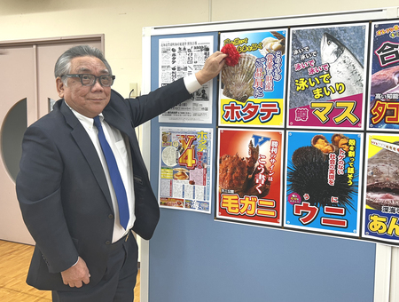 今回も約2万1600票の投票があり、同協会の金丸孝理事長が9日、当選したホタテのポスターに花を付けて祝福した。岡本貴光事務局長は「豊浦町で豊富な種類の水揚げがされていることがPRできたと思う」と評価。町へのふるさと納税を検討するとのコメントも投票者から寄せられているという。