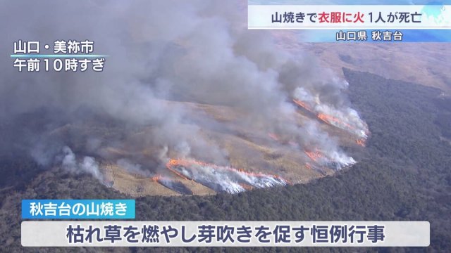 山口県美祢市の秋吉台で恒例の山焼きが行われ、衣服に火が燃え移り、作業していた1人が死亡しました。