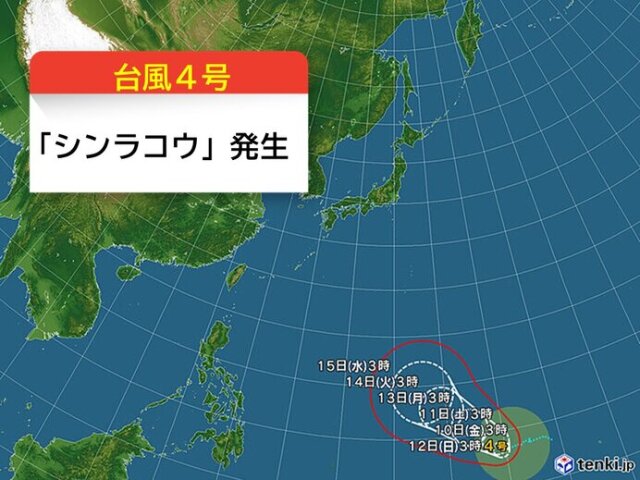 今日10日(金)午前3時、トラック諸島近海で台風4号「シンラコウ」が発生しました。中心気圧は996hPa、中心付近の最大風速は18m/s、最大瞬間風速は25m/sとなっています。台風4号は今後北西に進み、来週後半には日本の南の海上へと進む可能性があります。最新の気象情報を確認するようにしてください。