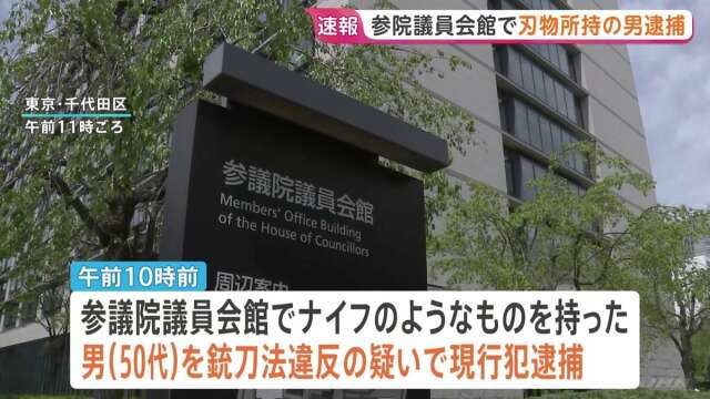 捜査関係者によりますと、きょう午前10時前、東京・千代田区の参議院議員会館で、ナイフのようなものを持った50代の男が銃刀法違反の疑いで現行犯逮捕されました。