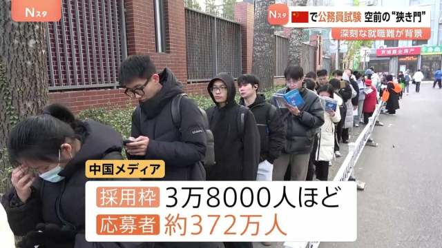 中国・北京では、早朝から国家公務員の試験を受ける人々が試験会場で長い列をつくりました。中国メディアによりますと、3万8000人ほどの採用枠に対して、応募者はおよそ372万人。