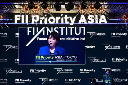 フューチャー・インベストメント・イニシアチブ(FII)に登壇した高市早苗首相=1日、東京都港区 「Just shut your mouths… invest everything in me!(いいから黙って全部俺に投資しろ)」。高市早苗首相は1日、東京都内で開かれたサウジアラビアが主導する国際金融に関する会合で、漫画「進撃の巨人」の有名なせりふを用いて日本への投資を呼び掛けた。