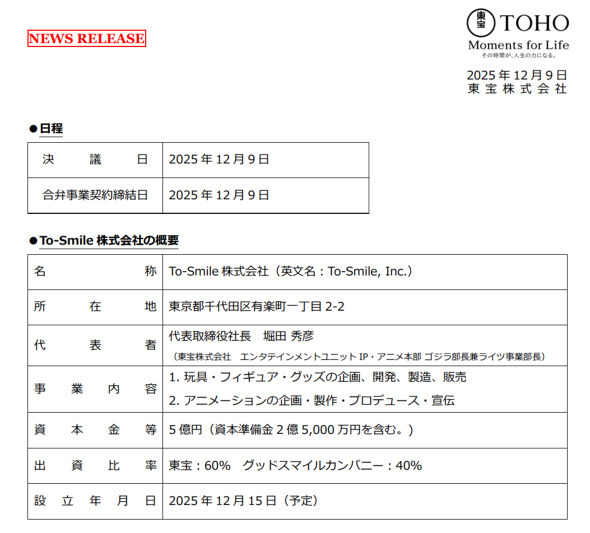 新会社の資本金は5億円(資本準備金2億5000万円含む)で、12月15日付けで設立予定。東宝が60%、グッスマが40%を出資する。社長には東宝の堀田秀彦氏(エンタテインメントユニット IP・アニメ本部 ゴジラ部長兼ライツ事業部長)が就任する。