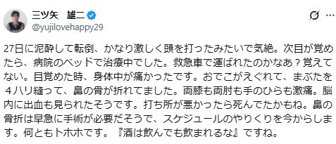 続けて「脳内に出血も見られたそうです。打ち所が悪かったら死んでたかもね。鼻の骨折は早急に手術が必要だそうで、スケジュールのやりくりを今からします。何ともトホホです。『酒は飲んでも飲まれるな』ですね」と締めくくった。