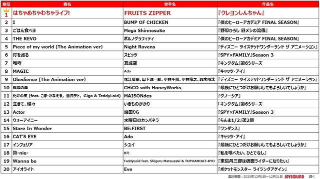 今シーズン、カラオケで最も歌われたのは、FRUITS ZIPPERが歌うTVアニメ『クレヨンしんちゃん』新主題歌「はちゃめちゃわちゃライフ!」。予測不能で元気いっぱいな楽曲展開が、自由奔放な作品の世界観と抜群の親和性を発揮。FRUITS ZIPPERらしさあふれる明るくキャッチーなメロディと、耳に残るフレーズが印象的で、初めて聴いても思わず口ずさんでしまう中毒性の高い一曲です。