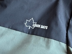 筆者が購入したのは「濃緑」というカラーです。肩周りは黒の切り替えになっており、全体にメリハリのあるデザインです。胸元には「LOGOS DAYS」のロゴマークが入っています。このマークは刺しゅうではないので、洗濯を繰り返すと剥がれる可能性がある点には注意が必要です。