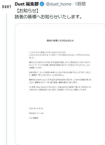 同雑誌は「このたび、Duetは2025年12月号(11月7日発売)をもちまして、休刊することとなりました」と発表。「創刊からこれまでの39年間、多くの読者の皆様、そして、取材させていただいた多くのタレント・アーティストの皆様、関係者の皆様に支えていただき歩んでこられたこと、心から感謝しています」と感謝を述べ、「誌面を通じて、少しでも読者の皆様の心に彩りや幸せをお届けるすことができていましたら、編集部一同こんなにうれしいことはありません」とつづった。