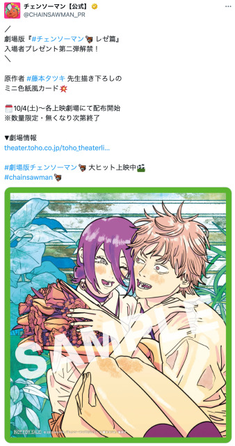 興行収入29.8億円を突破している劇場版『チェンソーマン レゼ篇』(9月29日現在)。各劇場で入場者特典第1弾の配布終了が相次ぐなか、第2弾として藤本タツキ描き下ろしのミニ色紙風カードが10月4日より配布される。カードにはデンジに“お姫様抱っこ”をされながら満面の笑みを浮かべるレゼが描かれている。