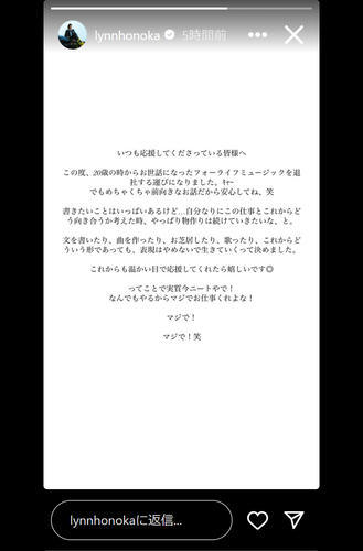 シンガー・ソングライターのLYNN HONOKA(28、旧名義:ほのかりん)が1日、インスタグラムを更新。所属レーベル、フォーライフミュージックエンタテイメントを退社したことを報告した。