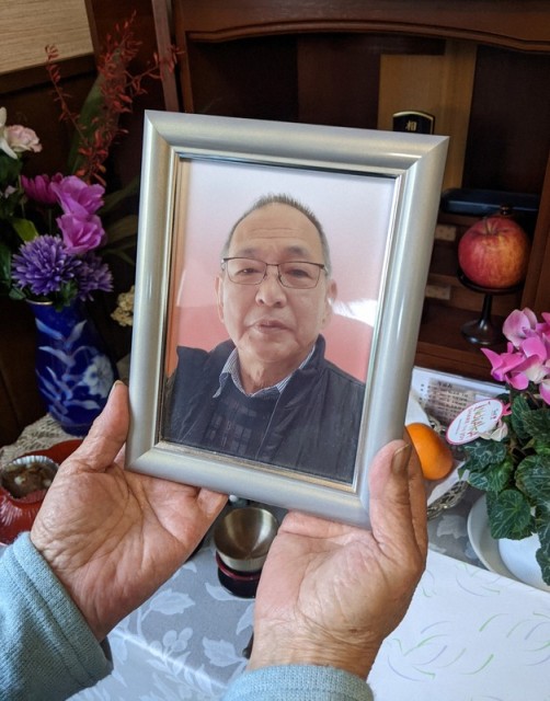 相嶋静夫さんの遺影を前に当時の無念さを語る妻美代子さん=静岡県富士宮市で2023年12月13日午後4時4分、遠藤浩二撮影