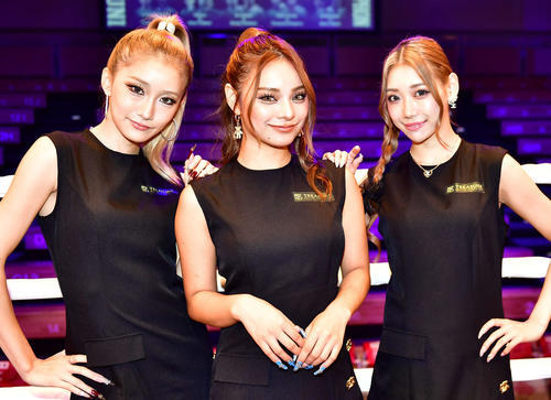 姉ギャル系雑誌「nuts」モデルの、あおぽん(26)まぁみ(24)わだあり(25)がゲストラウンドガールを務め、会場を沸かせた。