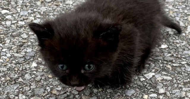 最初の1枚は、トトちゃんと出会ったときの写真です。路上で見つかった赤ちゃん猫で、おすんしぃさんが保護しました。アスファルトの上で身を小さく丸めておびえている様子からは、道端で1匹になってしまい、すごく心細かったことが伝わってきます。その姿を見て、おすんしぃさんは迷わずお家へと迎え入れたのでしょうね。