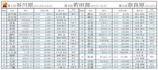 なお、チームをリーグ優勝に導いた「小久保 裕紀(こくぼ)」監督の 名字「小久保」さんは14位だった。(CHIGAKO)