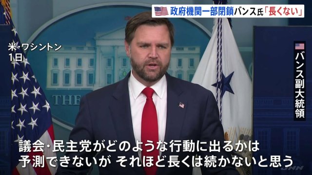 アメリカで「つなぎ予算」が成立せず、政府機関の一部が閉鎖されたことについて、バンス副大統領は「長くは続かない」との見通しを示しました。