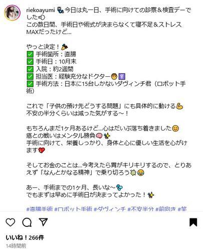 歩は、手術に向けた診察と検査を受けたことを報告するとともに「この数日間、手術日や術式が決まらなくて寝不足&ストレスMAXだったけど…やっと決定!」とし、手術日が10月末に決まったことや、手術支援ロボット「ダヴィンチ」を用いた手術となることなどを伝え、「これで『子供の預け先どうする問題』にも具体的に動ける 不安の半分くらいは減った気がする〜!もちろんまだ1ヶ月あるけど…心はだいぶ落ち着きました」と率直な心境を明かした。
