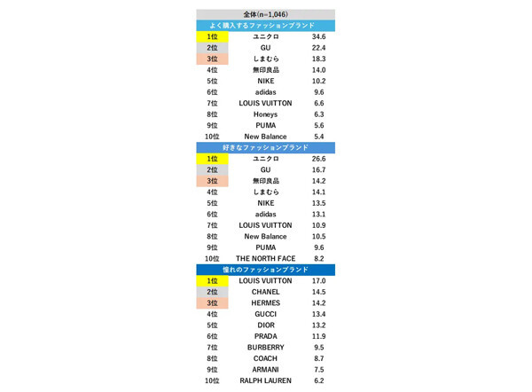 一方、「憧れのファッションブランド」ではハイブランドの名が並び、現実的な購買ブランドと理想のブランドのギャップがうかがえる結果となった。