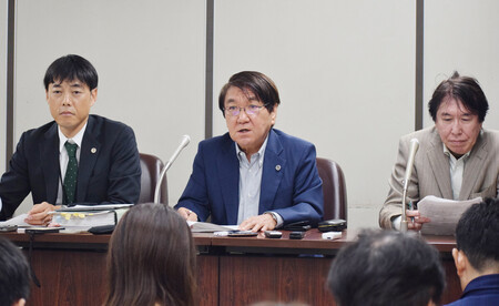 世界平和統一家庭連合(旧統一教会)と元信者3人の調停が成立し、記者会見する全国統一教会被害対策弁護団の村越進団長(中央)ら=2日午後、東京都千代田区 世界平和統一家庭連合(旧統一教会)に元信者らが献金の返還などを求めた集団調停で、全国統一教会被害対策弁護団は2日、3人について東京地裁で初めて調停が成立したと明らかにした。教団側が解決金として計五千数百万円を支払う。