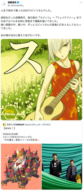 投稿には「人生で初めて買ったCDがスピッツさんでした。」とコメント。続けて「高校生だった投稿時代、毎日毎日『スピッツ』〜『フェイクファー』までの全アルバムをお供に深夜まで漫画を描いてました。暗い部屋の中、眠い中、ずっとスピッツさんの音楽に灯をともしてもらってました。あの頃の自分に教えてあげたいです。」とスピッツに下積み時代に支えられていた過去を明かしている。高校時代の遠藤の耳にあったスピッツのアルバムたち。スピッツなしでは『SPY×FAMILY』は生まれなかったのかもしれない。