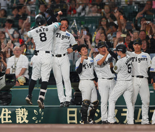 阪神対ヤクルト 5回裏阪神1死二塁、佐藤輝(左端)は右越え2点本塁打を放ち森下とエルボータッチする(撮影・上山淳一)<阪神−ヤクルト>◇2日◇甲子園