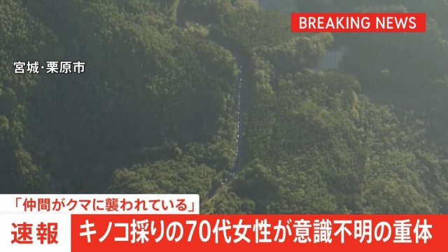 栗原市によりますと、4人でキノコ採りをしていたところ、クマに襲われ、そのうち70代の女性が意識不明の重体だということです。