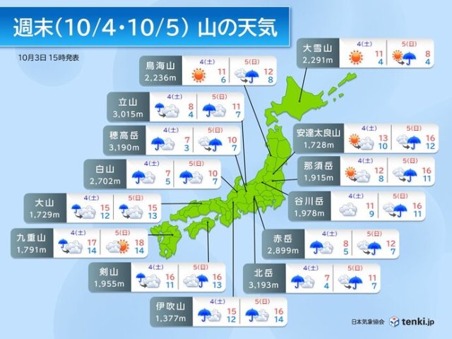 今週末は、北日本は高気圧に覆われて紅葉登山が満喫できそうです。一方、東日本と西日本の広い範囲で雨が降るでしょう。日本アルプスなどの高山帯では紅葉の最盛期を迎えたところも出てきていますが、気象情報を十分確認したうえで登山計画を立てるようにしてください。
