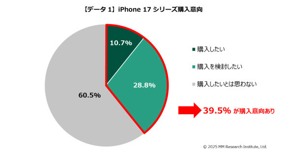 MM総研は、10月2日に「iPhone 17シリーズ購入意向調査(2025年9月時点)」に関する調査結果を発表した。調査対象はiPhoneを利用している15〜69歳の男女で、回答件数は1583人。