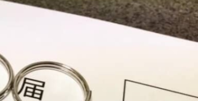 よく見る各種届出に使われる横書きの書式に、令和7年9月20日届出と記入され、提出先は伏せられていますが、書類の上にはリングが3つ置かれています。これは、ズバリ結婚の報告ではないでしょうか!? ……リングが3つ??