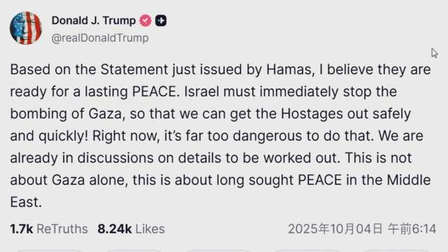 トランプ大統領は3日、「ハマスが発表した声明に基づき、彼らは永続的な平和への準備ができていると信じる。イスラエルはガザへの爆撃を直ちに停止しなければならない」とSNSに投稿しました。