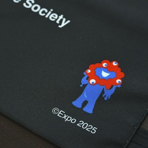 黒のシンプルなナップザック。フロントはミャクミャクと英字をさりげなくあしらい、背面はミャクミャクのリング部分と万博のロゴをプリントしています。主張しすぎないちょうどいいデザインがポイントです。