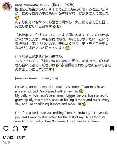 そして「『お仕事は、引退するの?』とよく聞かれますが、このお仕事が大好きなので、需要がある限り、生涯現役でいたい!という気持ちは、変わらないので、無理なくマタニティライフを楽しみながら続けたいと思っています」と宣言。