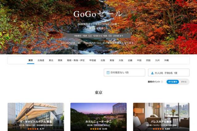 一休は、旅行予約サイト「一休.com」で、「GoGoセール」を10月4日正午から5日まで開催している。