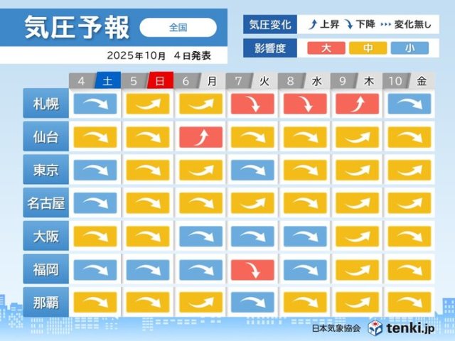 ¤½¤Î¸å¤âµ¤°µ¤Î¥¢¥Ã¥×¥À¥¦¥ó¤¬Â礤¯¤Ê¤ê¤½¤¦¤Ç¤¹¡£7Æü(²Ð)¤ÏÀ¾¤«¤éÄ㵤°µ¤¬¶á¤Å¤¡¢»¥ËÚ¤äÊ¡²¬¤Çµ¤°µ¤¬Äã²¼¤·¡¢±Æ¶ÁÅÙ¤¬Â礤¤¤Ç¤·¤ç¤¦¡£8Æü(¿å)¤ÏÁ´¹ñŪ¤Ëµ¤°µ¤¬Äã²¼¤·¡¢»¥ËڤDZƶÁÅÙ¡ÖÂç¡×¡¢ÀçÂæ¤äÅìµþ¡¢Ì¾¸Å²°¡¢ÆáÇÆ¤Ç±Æ¶ÁÅÙ¡ÖÃæ¡×¤È¤Ê¤Ã¤Æ¤¤¤Þ¤¹¡£