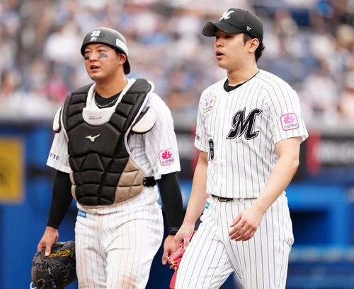 ロッテ対日本ハム 5回表を終え、佐藤(左)と話しながらベンチへ戻るロッテ種市(撮影・鈴木みどり)