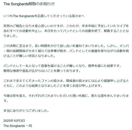 また、ボーカル&ギターの松原有志(31)は、「メンバーとは何度も話し合いを重ねてきましたが、これまで大切にしてきたことと、これから大切にしたいことを、ソングバーズらしさを保ったまま両立させることは、どうしても難しくなってしまいました」。