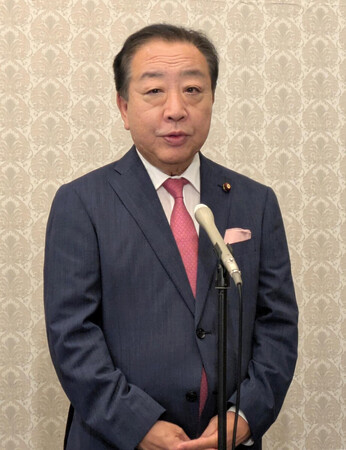 記者団の取材に応じる立憲民主党の野田佳彦代表=4日午後、千葉市 自民党新総裁に高市早苗前経済安全保障担当相が選ばれたことを受け、野党各党は今後の首相指名選挙や国会運営などで、協力の在り方を探ることになる。高市氏は、自民派閥の裏金事件に関与した議員の役職起用に前向きな考えを示しており、新体制をけん制する声も上がった。