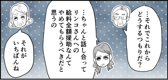 しかし離婚を決める前に、父から提案が。キョウタが「家族なんだから助け合うのが当然」と言うのであれば、キョウタの「家族の助け合い」が義実家だけに向けられているのか試す策はどうかと考えてくれたのです。