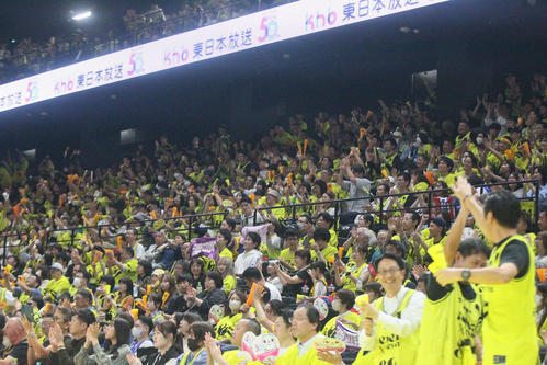 仙台対茨城 勝利にわくB1仙台ブースター(撮影・高橋香奈)