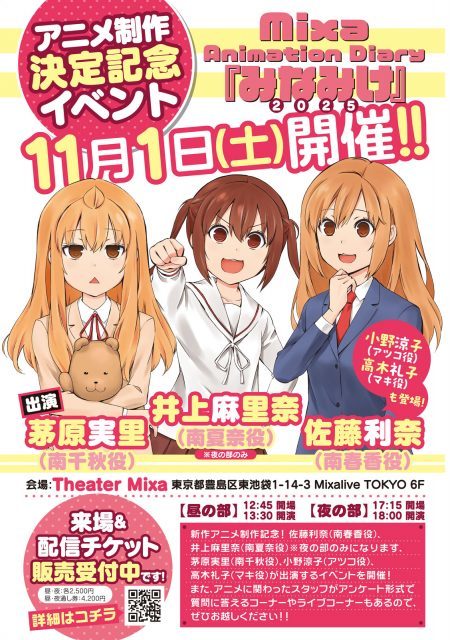 『みなみけ』新作アニメ制作記念イベント開催決定 アニメ『みなみけ』の新シリーズ(第5期)制作を記念したイベントが、11月1日にTheater Mixaで開催されることが決定した。出演:は佐藤利奈(南春香役)、井上麻里奈(南夏奈役)、茅原実里(南千秋役)、小野涼子(アツコ役)、高木礼子(マキ役)となっている。※井上麻里奈は夜の部のみの出演。