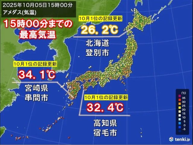 今日5日は季節外れの暑さとなり、最高気温は10月1位の記録を更新した所が続出しました。北海道では所々で夏日に。関東から西では所々で真夏日となり、真夏日地点は6日ぶりに100地点を超えました。宮崎県串間市や沖縄県久米島では34.1℃と猛暑日に迫る暑さとなりました。明日6日は北海道では気温が急降下するでしょう。一方、関東から西では季節外れの暑さが続きそうです。