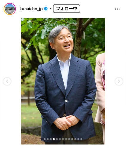 インスタグラムでは、両陛下が京都府立植物園(京都市左京区)を視察した様子などをアップ。天皇陛下は紺のジャケットに水色のストライプのシャツ、グレーのスラックスのスタイルで、皇后さまはピンクベージュのパンツスーツに、鮮やかな花柄のスカーフを着用された。両陛下がスタッフの説明を受ける場面や、動物園のクマにえさとして届けるどんぐりを集める、クマ型の「どんぐりポスト」を笑顔で見つめる写真なども公開。おふたりの晴れやかな笑顔の写真もアップされた。