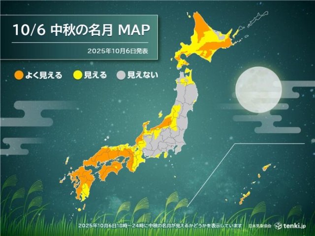 今日6日(月)は「中秋の名月」です。今夜は、近畿地方では晴れて、「中秋の名月」を見られる所が多いでしょう。また、明日7日(火)は満月となります。明日も近畿地方では、お月見を楽しむことが出来そうです。
