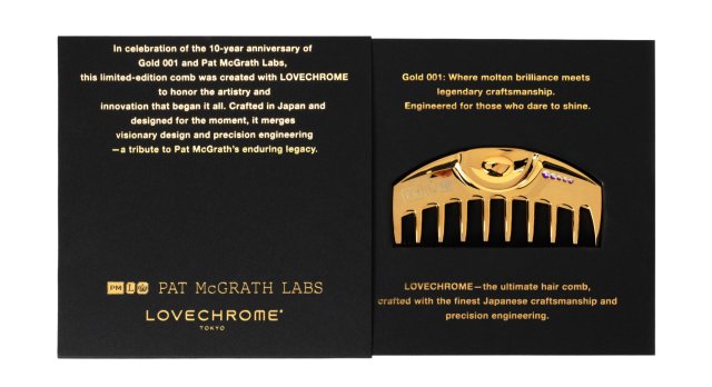 限定2アイテムは、「パット マクグラス ラボ×ラブクロム ツキ ゴールド コーム」と「パット マクグラス ラボ×ラブクロム ウエービーツキ ゴールド コーム」(それぞれ175ドル、約2万6000円)。ラブクロムを代表するモデル「K24GPツキ ゴールド」、「K24GPウエービーツキ ゴールド」に、パット マクグラス ラボのブランドロゴを施し、日本の繊細や技術と美しさを映し出す造形にこだわった紙製パッケージを採用した特別仕様モデル。24金を含むなめらかなコーティングと、髪をいたわり艶やかに輝かせるラブクロムの技術力に、ゴールド 001の象徴的なゴールドカラーを重ね合わせた特別モデルが、001のアニバーサリーを華やかに飾る。