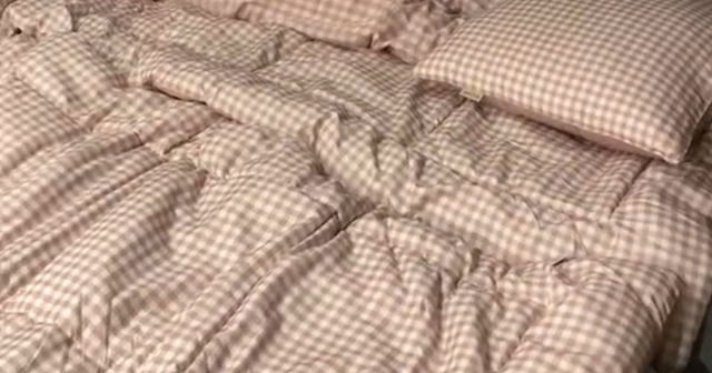 動画の冒頭で映し出されたのは、ゲストハウスの大きなベッド。枕も布団もベージュ色のギンガムチェック柄のカバーでまとめられた、居心地の良さそうな空間です。しかし、次の瞬間……。