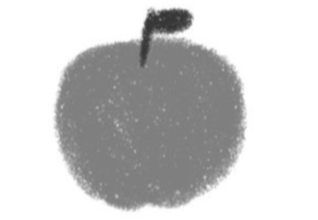 1つ目のリンゴは灰色と黒色だけで描いたもの。リンゴはもともとのシルエットが特徴的なため、一目で何が描かれているか判別できますが当然ながら赤くは見えません。
