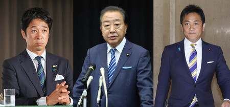 (左から)日本維新の会の藤田文武共同代表、立憲民主党の野田佳彦代表、国民民主党の玉木雄一郎代表