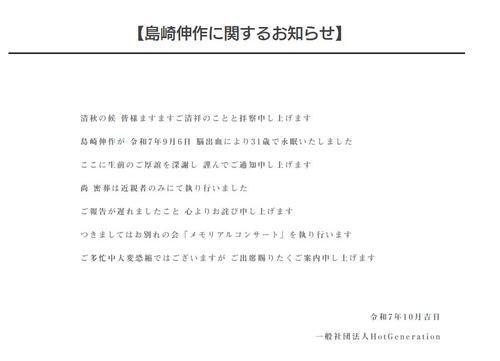 「弊社、業務提携の島崎伸作が、2025年9月6日、突然の脳出血のため31歳にて急逝いたしました。突然のことに、社員一同、未だ信じられない気持ちでおります。島崎伸作は、これまで俳優として多くの作品に出演し、見る人に感動と笑顔を届けてくれました。彼の残してくれた功績に、心より感謝申し上げます。密葬は近親者のみにて執り行われました」